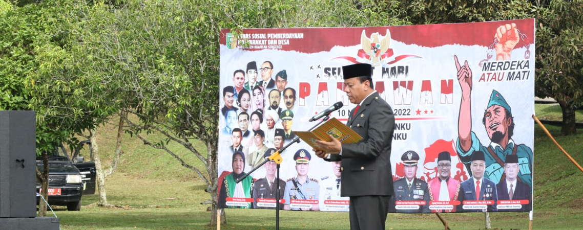 Teluk Kuantan- Upacara memperingati Hari Pahlawan Nasional yang kali ini mengusut tema " inspirasiku Pahlawanku". Plt Bupati Kuantan Singingi Drs. H. Suhardiman Amby, Ak., MM yang menjadi inspektur jalannya upacara di Lapangan Pemerintah Daerah, Kamis 10/11/2022...