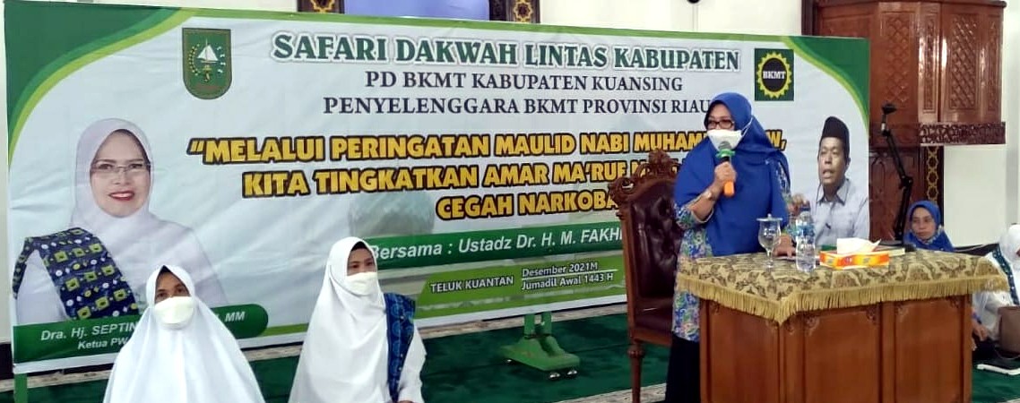 TELUK KUANTAN – Hj Yulia Suhardiman membuka langsung Safari Dakwah Lintas Kabupaten atau Tablig Akbar Badan Kontak Majelis Taklim (BKMT) Provinsi Riau bertempat di Masjid Agung Teluk Kuantan, Kamis (16/12/2021).