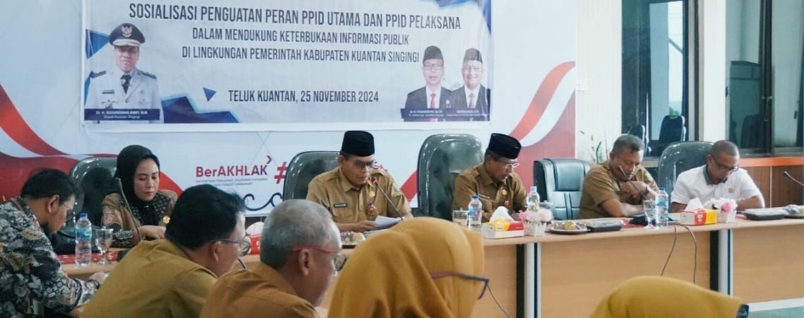 Teluk Kuantan - Pemerintah Kabupaten Kuantan Singingi (Pemkab Kuansing) melalui Dinas Komunikasi, Informatika Statistik dan Persandian (Diskominfoss) menggelar Sosialisasi Keterbukaan Informasi Publik, Senin (25/11) pagi, di Ruang Multimedia Kantor Bupati Kuansing.