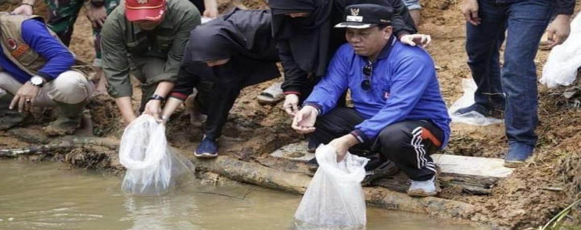 TELUK KUANTAN, — Plt Bupati Kuansing Drs H Suhardiman Amby Ak MM didampingi langsung Sekretaris Daerah (Sekda) H Dedy Sambudi SKep SKM MKes dan Plt Kepala Dinas Perikanan (Kadiskan) Kuansing Dr Agus Mandar SSos MSi tebarkan ribuan benih ikan air tawar, Ahad (26/06/2022) lalu di Desa Perhentian Sungkai Kecamatan Pucuk Rantau Kabupaten Kuantan Singingi (Kuansing), Riau.