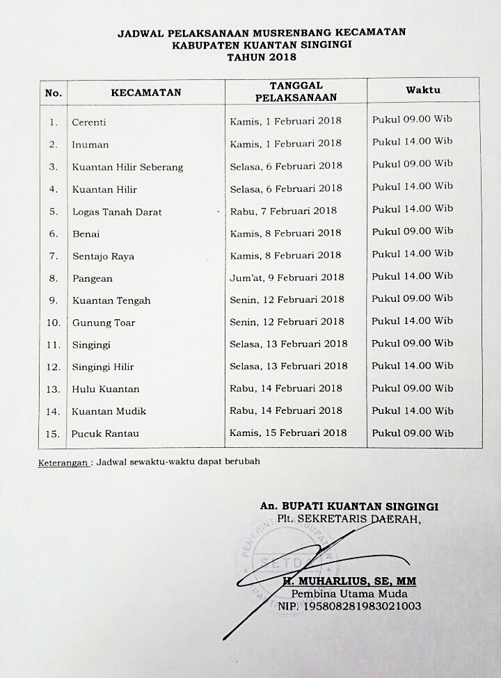 Jadwal Pelaksanaan Musrenbang Kecamatan Kabupaten Kuantan Singingi Tahun 2018