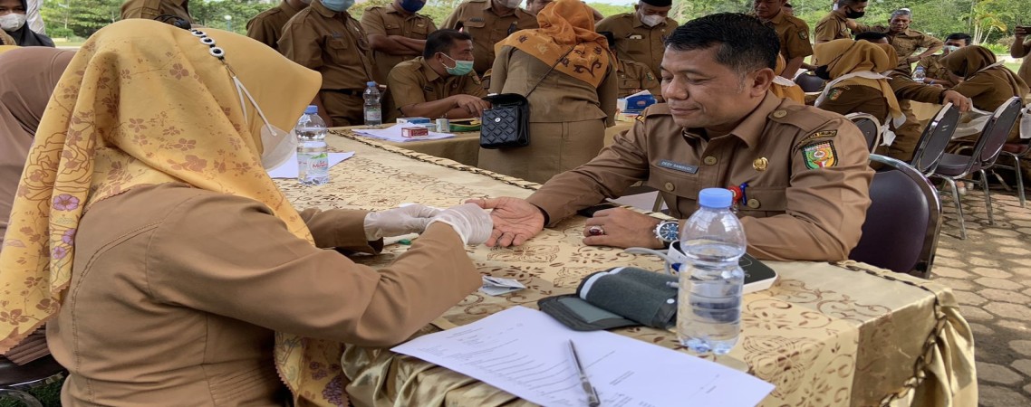 Teluk Kuantan- Kegiatan deteksi dini Penyakit Tidak Menular (PTM), Dinas Kesehatan Kuantan Singingi melakukan pengecekan kesehatan kepada para Aparatur Sipil Negara (ASN) di lingkungan Pemerintah Kuantan Singingi, di Lapangan Upacara Pemerintah Daerah, Senin (27/6/2022).