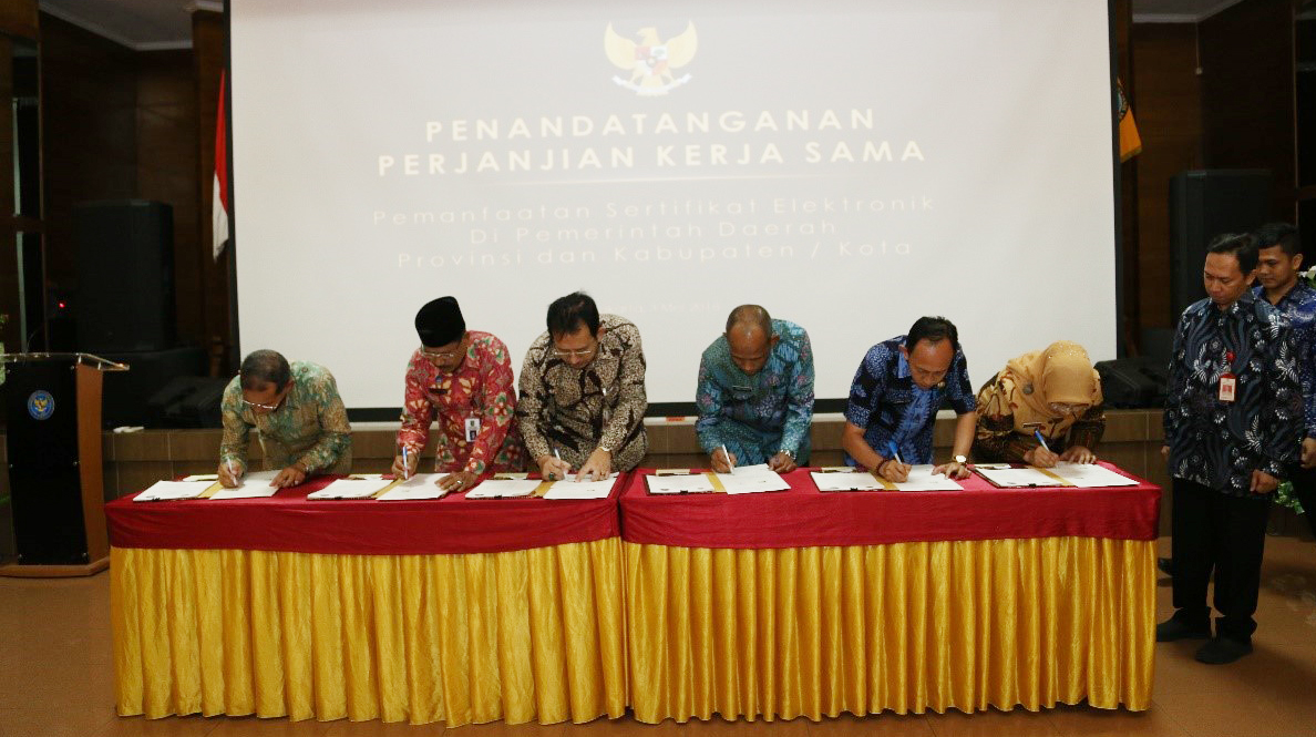 Terkait dengan hal tersebut, sesuai dengan Perpres Nomor 53 Tahun 2017 sebagaimana telah diubah dalam Perpres Nomor 133 Tahun 2017. Badan Siber dan Sandi Negara (BSSN) melalui Balai Sertifikasi Elektronik (BsrE) Bersepakat untuk melaksanakan penandatanganan Kerja Sama dengan 6 instansi Pemerintah yakni Pemprov Kalimantan Timur, Pemkab Pelalawan, Pemkab Banyumas, Pemkot Bandung, Pemkab Kuantan Singingi, dan Pemkab Tanjung Jabung Timur tentang Penerapan Sertifikat Elektronik pada Sistem Elektronik di Lingkungan Pemerintahan. Penandatanganan kerja sama ini dilaksanakan di Aula Roebino Kertopati Badan Siber dan Sandi Negara Jalan Harsono RM Nomor 70 Jakarta Selatan pada tanggal 3 Mei 2018.
