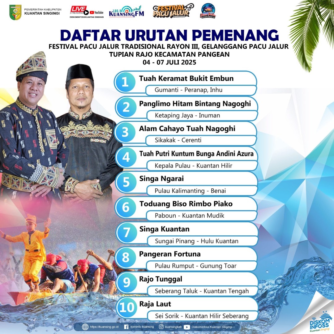 Daftar Urutan Pemenang Pacu Jalur Rayon III di Kecamatan Pangean